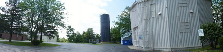 A three-shot panoramic photograph taken near the top of Campbell Hill looking east across an asphalt drive and at a range of different buildings, including a silo, in the Ohio Hi-Point Career Center complex.