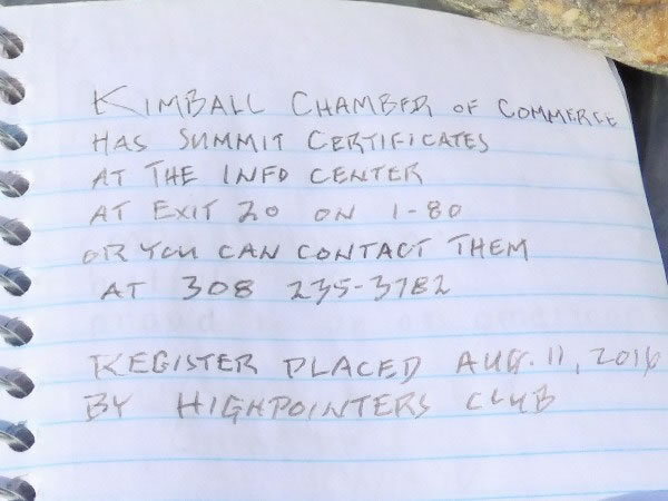 The drafting table contained a summit register that was put there by the Kimball Chamber of Commerce, and – true to its word – the Chamber of Commerce later sent me …