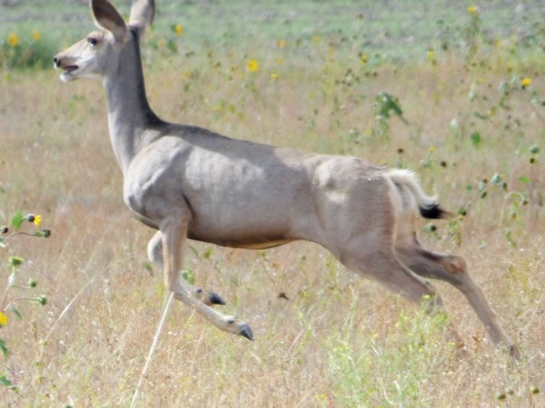 However, as I drove back towards Pine Bluffs and the I-80 interstate highway, I was pleased to see a female mule deer prancing through wild sunflowers alongside the road.