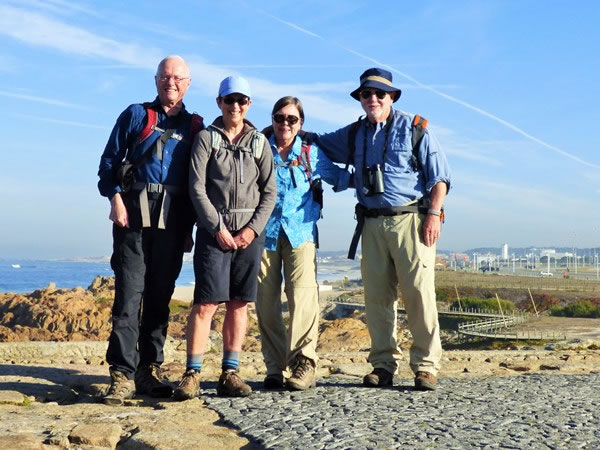 The four of us posed for a photograph. From left to right, Nigel Roberts, Heather Roberts, Peggy Wall, and Bob Slyker. The boardwalks that are a prominent feature of parts of the Caminho Português da Costa – the coastal Camino – can be seen both to the right of and behind Bob’s legs. |