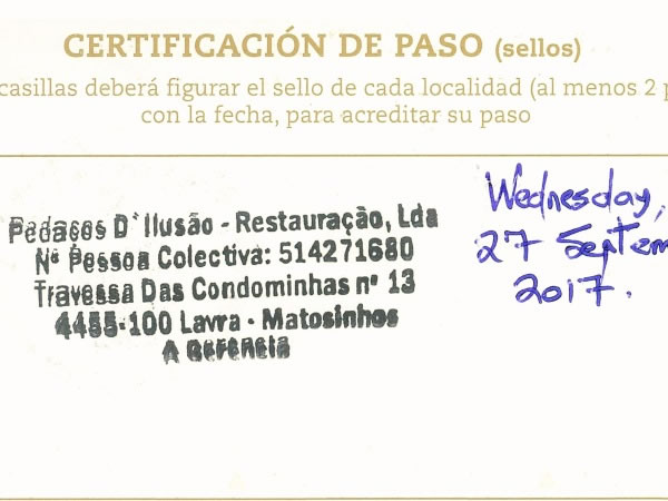 … and it was at the Pedaços d’Ilusão restaurant that each of us got the first stamp in our Credencial del Peregrino (that is, in our pilgrim’s passports). In order to qualify for our Compostelas when we reached Santiago, we had to get at least two stamps per day (al menos 2 por dia). |