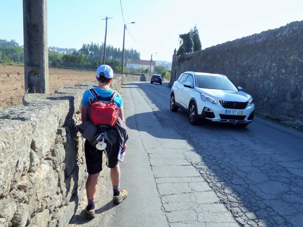 Day 2 (Thursday, 28 September 2017) – Vila do Conde to Arcos (9.8 kilometres / 6.1 miles): For the vast bulk of our second day’s walk, we were not on an official Camino route, but were heading inland in order to get from the Caminho Português da Costa to the Caminho Português Central. As a result, we sometimes had to walk on some fairly dangerous roads. In this instance, though, the car coming towards us gave us a wide berth. |