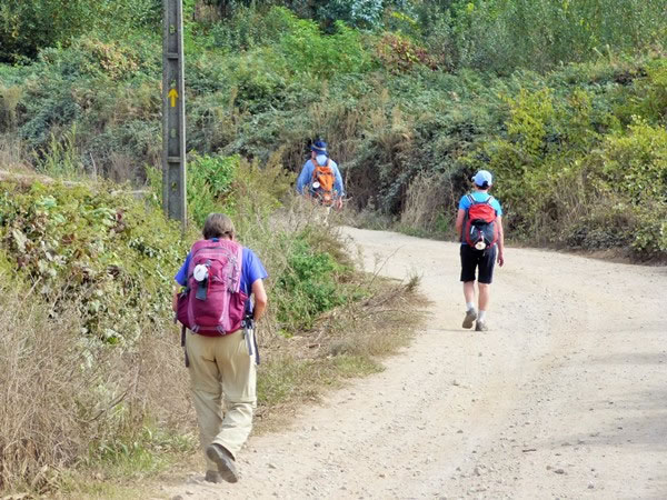 Bob, Heather, and Peggy making their way along a quiet back-country road and up a small hill.