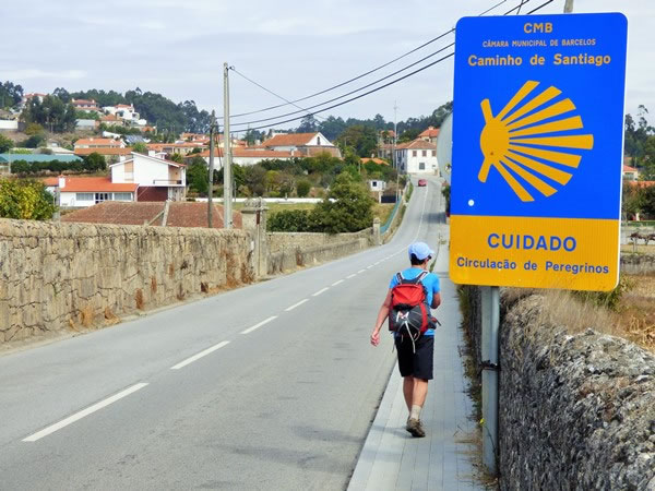 Day 3 (Friday, 29 September 2017) – Arcos to Barcelos (21.1 kilometres / 13.1 miles): To get into Pedra Furada, we had to walk alongside the N-306, which is a reasonably busy regional road, so we were pleased to see there was both a sidewalk and a large sign asking drivers to take care because pilgrims would be walking on it. |
