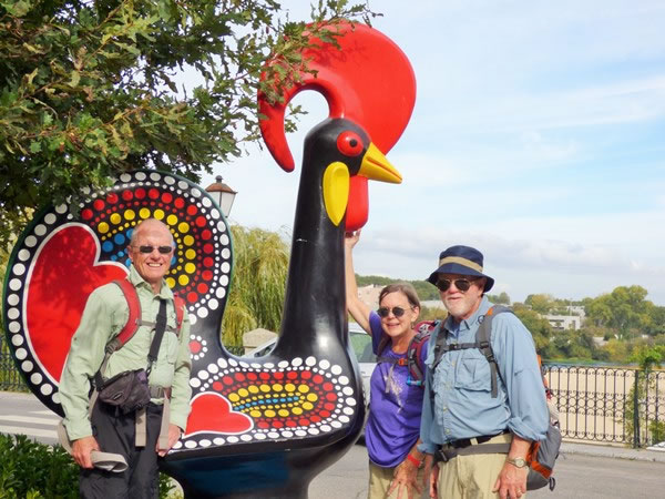 Day 3 (Friday, 29 September 2017) – Arcos to Barcelos (21.1 kilometres / 13.1 miles): We reached the banks of the Cávado river just after 4:00 pm, and paused while Heather took a photograph of me, Peggy and Bob standing beside one of what The Lonely Planet calls “the great and brilliant cocks sprinkled along Barcelos streets like bigger-than-life chess pieces.” |