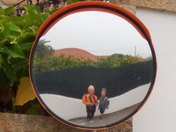 Day 7 (Tuesday, 3 October 2017) – Cossourado to Valença (13.4 kilometres / 8.3 miles): Another portrait of the artist and his spouse. (You may think that my shirt was deliberately chosen to match the orange frame round the traffic mirror, but I couldn’t possibly comment.) |