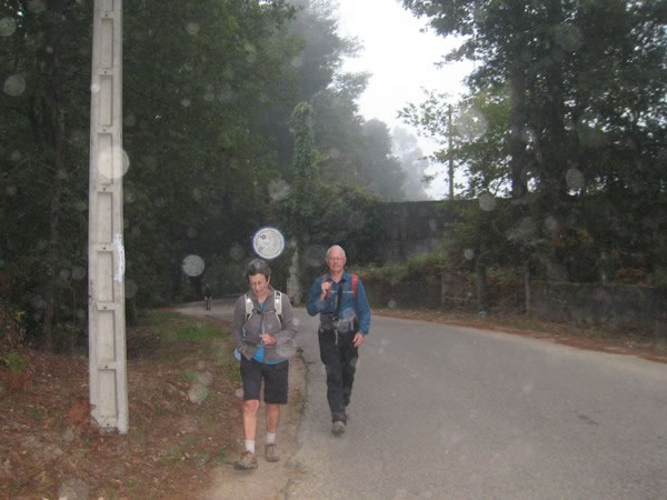 Bob took this picture of Heather and me walking in the mist and along a country road.