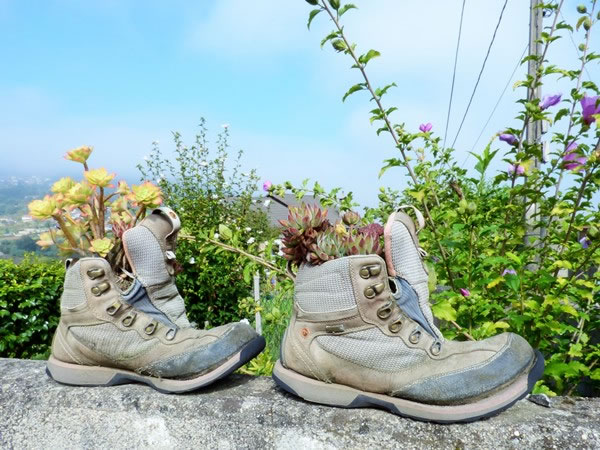 The morning mist began to lift as we neared Redondela, which is also when we saw these old boots used as flower pots.