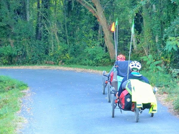 Pedalling pilgrims: the cyclist on the first of these recumbent tricycles was towing a trailer that had a small child in it.