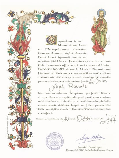 My compostela. (My 2010 compostela wrote my surname in Latin – “Robertum”; this time, though, it was just “Roberts”.)