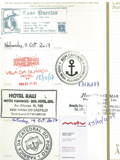 Day 21 (Tuesday, 17 October 2017) – In Porto: On our last full day in Portugal, we got our pilgrim’s passports stamped in the Porto cathedral. The final page of my Credencial del Peregrino also contains the stamps of the six hotels (well, in Oia it was really a B&B) that Heather and I stayed in while we journeyed south from Santiago de Compostela. |