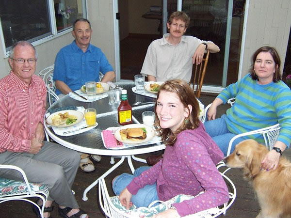 On Tuesday, 26 June 2007, Eric Hodge and Roger Marcus successfully reached the summit of Mt Hood, the highest mountain in Oregon. I didn’t. Somewhere near Crater Rock, at an altitude of about 10,200 feet / 3,100 metres, I told Eric and Roger that I was going to turn round and head back down to Timberline / Wy'east and that they should go on without me. The following evening, on the patio of Roger and Amanda’s Lake Oswego home, we celebrated Eric and Roger’s success. From left to right: Nigel Roberts, Eric Hodge, Roger Marcus, Monica Marcus, and Amanda Marcus. |