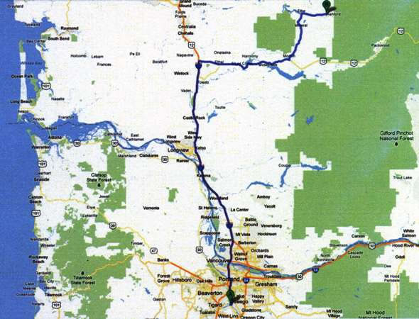 We left Portland at 11:35 am and drove north on interstate highway 5 (the I-5N); then east on US highway 12 as far as Morton; north on Washington state highway 7 to Elbe; and finally east again on Washington state route 706 to Ashford, which we reached at 2:20 pm. |
