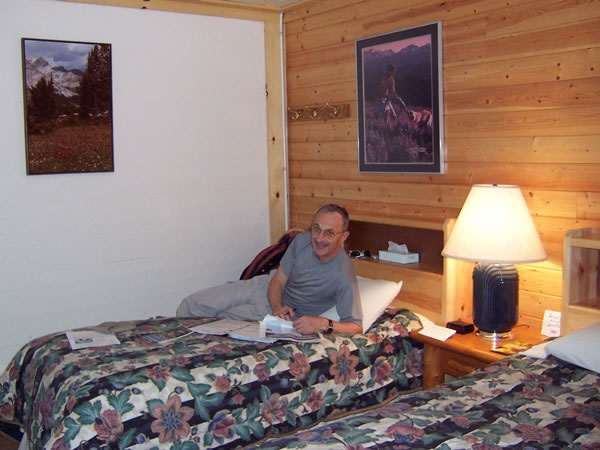 Eric relaxing in our motel unit and perusing information about the Mt Rainier National Park.