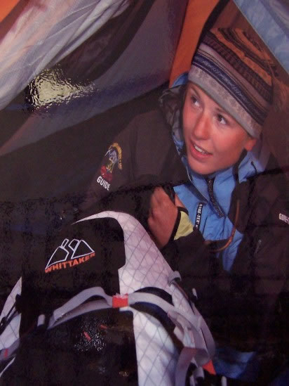 In addition to working as an RMI guide, Melissa Arnot is also a professional paramedic and a part-time model. This is a photograph of a poster featuring Melissa modelling mountaineering gear.