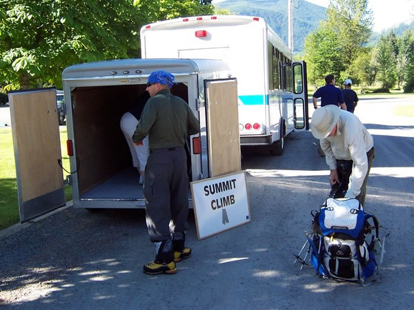 At 8:30 am, we loaded our gear into a trailer and hopped on a bus that would take us to Paradise, the Mt Rainier National Park headquarters, which are situated at 5,420 feet / 1,652 metres above sea-level on the lower slopes of the southern side of the mountain. |