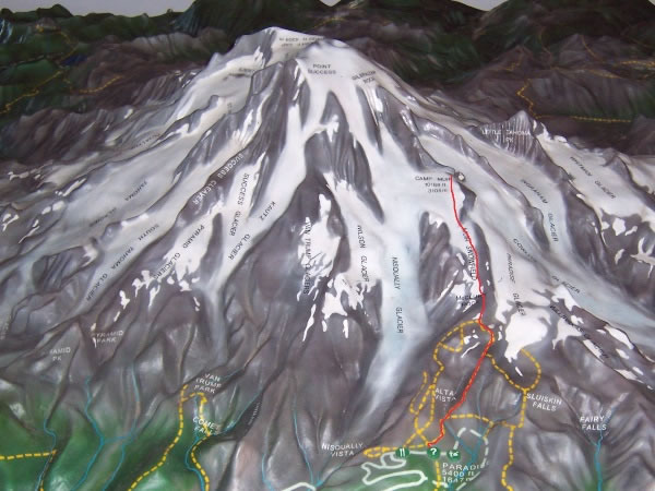 I’ve marked the route we took from Paradise to Camp Muir in red on this photograph I took of a model in the Park headquarters of the mountain.
