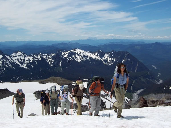 During our second rest, we were passed by another RMI guided party. The easy – almost nonchalant – gait of the guide leading the group was in stark contrast to the laboured – almost lumbering – style of the climbers behind her. The lead guide was rest-stepping: her left leg is straight and thus weight-bearing, while she lifts her right leg and moves it forward. |