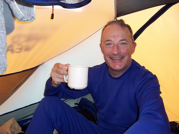 “You canna hand a man a granda cuppa”: Eric enjoying afternoon tea in our tent at Camp Muir.