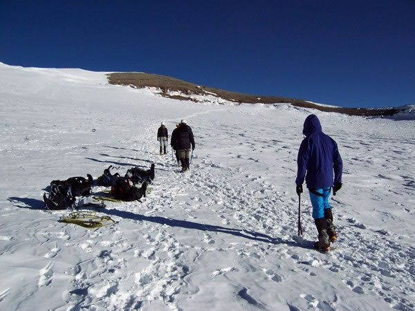 Shortly before 7:00 am, we reached Mt Rainier’s crater. We stopped and took off our rucksacks. I was exhausted! I felt I couldn’t take another step, and I told the rest of the party – Eric, Melissa, and the two who’d joined our rope – to go on without me. Reaching the crater is regarded by some as summiting, and I reluctantly thought I’d have to adopt that line of reasoning too. After ten minutes or so, though, I pulled myself together, got to my feet, and began trudging slowly across the crater floor … |