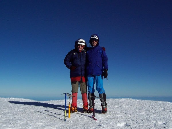 ... and just before 7:30 am I reached the 14,411-foot / 4,392 metre summit of Mt Rainier, where Melissa took this photograph of Eric and me. Mt Rainier is the fourth highest of the fifty US state highpoints, and is rated the fourth hardest to climb. It was also the fourth of July. |