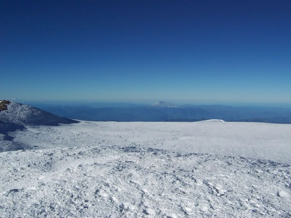 Looking south from the summit of Mt Rainier: Mt St Helens can be seen on the horizon in the middle of the picture, while Mt Hood is just visible on the left-hand edge of the photo.