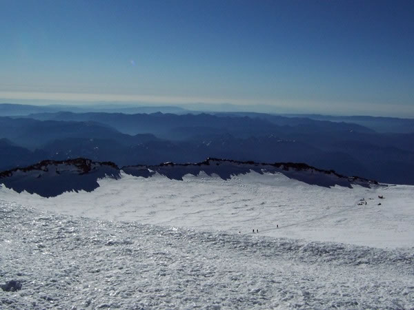 Looking east across the crater from the summit of Mt Rainier. The spot where we left our rucksacks can be seen near the right-hand edge of the picture.