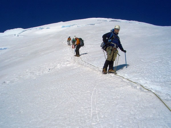 We returned to the spot where we’d cached our gear, and sometime after 8 o’clock we hoisted our packs on our backs and began our descent. Eric initially led our rope-team down the mountain. Around 9:30 am he paused, turned round, and took this photo looking back up at the rest of us. It shows just how right Eric had been to oppose adding the two newcomers to our rope (they are the two people who were nearest to Eric when he took this picture). The two young men were tired and clumsy. The one closest to the camera was standing with his crampons on the rope. Both were a very real threat to their own lives, as well as to ours. |