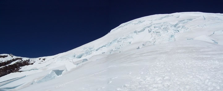 During a pause on our descent, sometime around 10:00 am, I took two photos which I’ve since stitched together to create this panoramic view of the slopes of Mt Rainier’s volcanic cone.