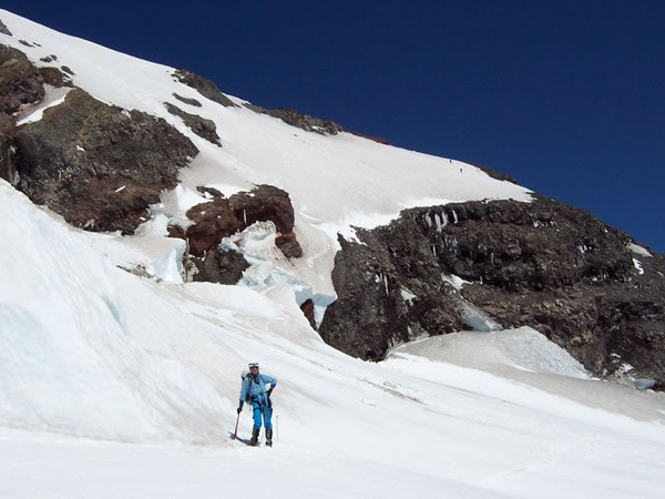 Looking back at Eric on the Ingraham glacier. The route through the central section of Disappointment Cleaver is clearly visible in the middle of the picture. It was a beautiful day and, as a result, fairly warm, which was why we didn’t dawdle while descending Disappointment Cleaver. |