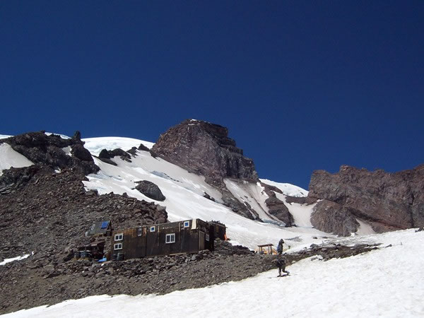 We got back to Camp Muir at 12:30 pm, where we had lunch and a rest, prior to setting off again at 2:00 pm. A few minutes later I took this picture looking back up at Camp Muir with Gibraltar Rock immediately above it.