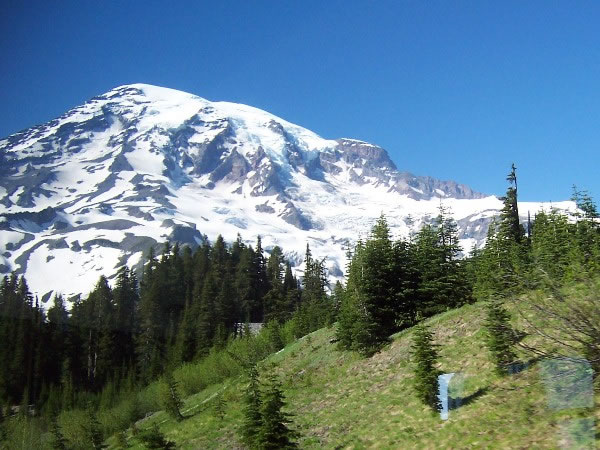 We got back to Paradise at 4:20 pm. Our entire descent – from the crater to Paradise – had taken us eight-and-a-quarter hours; our descent from Camp Muir has taken us only two hours and twenty minutes. I took this picture looking back up at Mt Rainier at 4:45 pm, while we were in the bus heading down from Paradise to Ashford. |