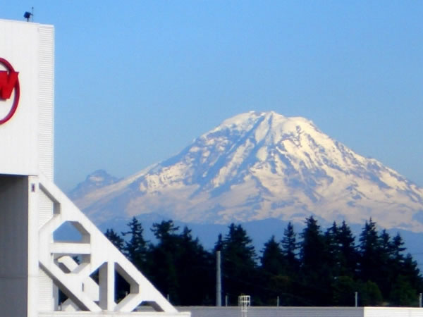 On Friday, 6 July, we left Dennis and Evette’s house and drove to Seattle airport to begin our long flights home, and it was at Seattle airport that Eric took this final picture of Mt Rainier and (on the left) Little Tahoma. Only two days earlier, we’d stood proudly on Rainier’s 14,411-foot / 4,392 metre summit: it had been a great trip. (This is the last picture in this album.) |
