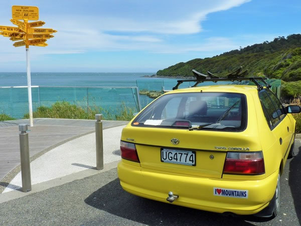 On Wednesday, 18 January 2012 the day after Jiff Stewart, Heather, and I finished walking the Kepler Track we drove from Te Anau to Bluff. This is a picture of our car at the southern terminus of State Highway 1, which has been described as the longest and most significant road in