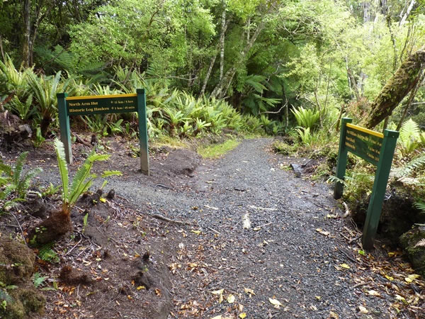 At 1:10 pm we reached this turn-off: the track on the left is to North Arm Hut. Jiff, Heather and I continued straight ahead making our way towards Port William Hut, which – according to the sign on the right-hand edge of this photograph – was 1.9 kilometres (or 45 minutes) away. |