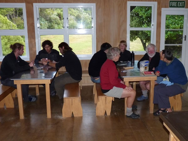 Socialising in the Port William Hut. The three young men on the left were Israeli backpackers.