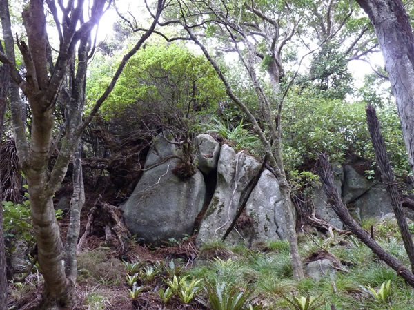 A section of the track between North Arm Hut and Halfmoon Bay passes some large granite boulders with …