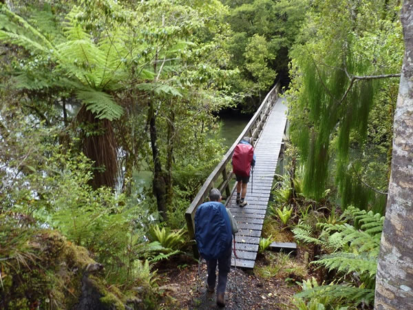 Heather and Jiff crossing a bridge over a river that flows into Kaipipi Bay.