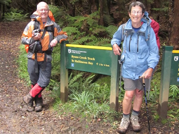 At 1:00 pm, we reached the junction of the Rakiura and Ryans Creek tracks, which is only about three-quarters of an hour’s walk from Oban. Jiff was keen to get back to Oban to ring Lew, so we split up. Jiff continued hiking along the Rakiura Track, while Heather and I took the long way back to Oban – namely, via Ryans Creek Track. (Photo by Jiff Stewart.) |
