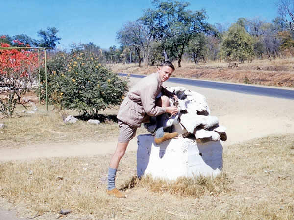 On Saturday morning, 2 July 1960, Richard and I got one ride straight through to Bulawayo, where we spent the night with family friends, Denis and Patricia Thompson. The following day we headed north again, and quickly got a ride with a Mr and Mrs Oliphant, who not only drove us from the outskirts of Bulawayo through to the coal-mining town of Wankie, but also put us up for the night in their Wimbledon Drive home. During the first of two rest-stops that the Oliphants made during the drive to Wankie, I took this photograph of Richard standing next to an elephant’s skull outside the Kenmaur Stores. |