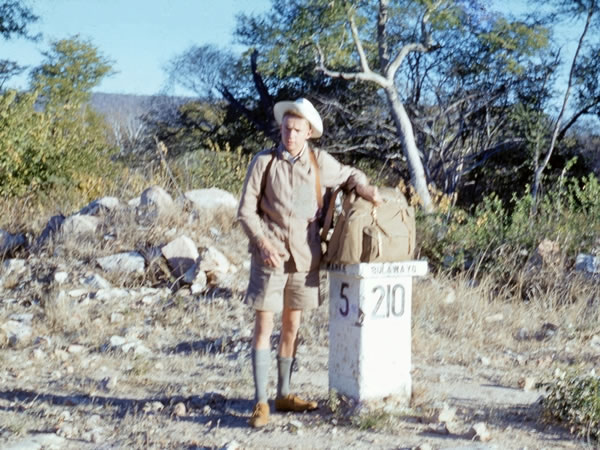 On Monday morning, 4 July 1960, Mr Oliphant took us back to the main road, five miles south of Wankie, where I took this photograph of Richard. He and I realised, though, that this was not a good spot for hitchhiking: we wanted cars going north out of Wankie, whereas most of the traffic at this junction was heading into Wankie. As a result, Richard and I hoisted our packs onto our backs and hiked … |