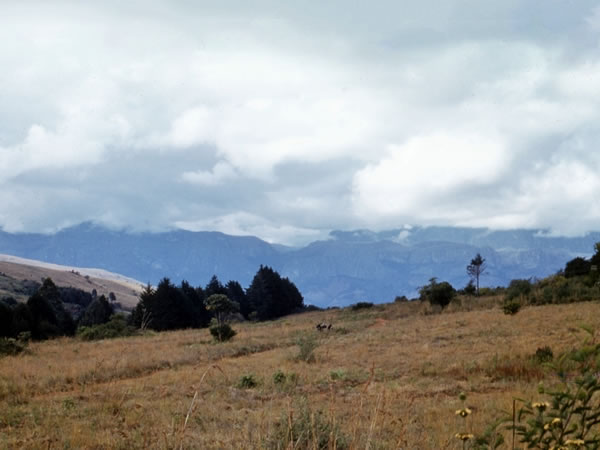 We left the Chimanimani Mountain Hut at 10:30 am on Tuesday, 12 July 1960, and headed back down Long Gully. Phil Murray – the President of the Mountain Club of Salisbury – invited Richard and me to join him and the other club members for “a huge lunch (six courses and wine)” at the Melsetter pub. After we had eaten “till we could eat no more”, I took this photograph looking back towards the Chimanimani mountains from the grounds of the hotel. |