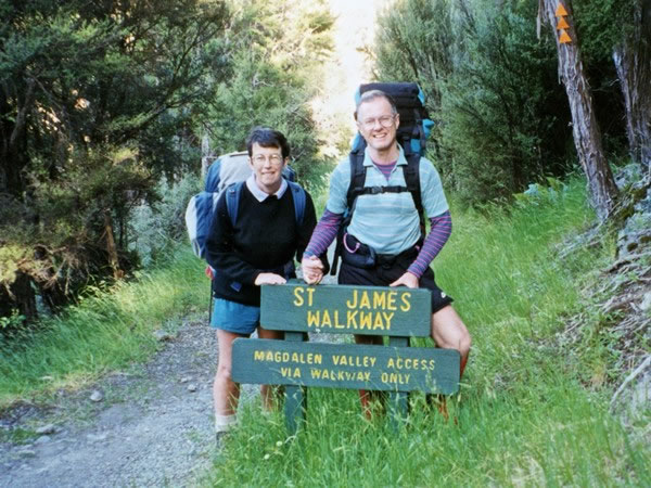 First of all, Heather and I took our car on a Wellington-to-Picton ferry on 18 December 1996, and we then spent three-and-a-half days hiking the St James Walkway. This photograph was taken of us on Sunday evening, 22 December 1996, at the end of our roughly 65-kilometre / 40-mile hike. |
