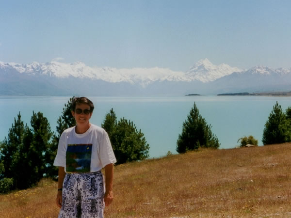 At 9:00 am on Sunday, 29 December 1996, Heather, Evan, and I left Christchurch and began driving the 500 or so kilometres / 300 miles to Queenstown. Christchurch friends of ours – Joy McLeod and her 22-year-old son, Keith – left at the same time. On a glorious summer’s day, we pulled off the road above Lake Pukaki to admire the view of Aorangi / Mt Cook, New Zealand’s highest mountain (3,724 metres / 12,218 feet), and Joy took this photograph of Heather. |