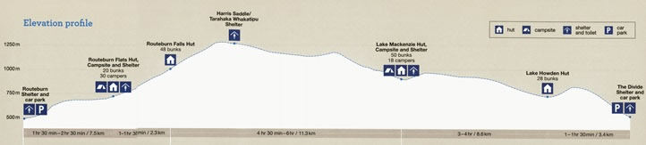 This Elevation profile (which I also photographed from a Department of Conservation pamphlet) shows how we climbed quite steeply on our first day on the track in order to reach the Routeburn Falls Hut. The following morning, we continued to climb as far as the Harris Saddle (and after that we went on an out-and-back detour up to the summit of Conical Hill). From the top of Conical Hill, however, it was almost a case of downhill all the way to the end of the track at The Divide. |