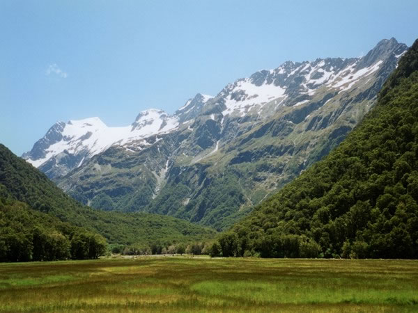 , north) across the Routeburn Flats at Mt Somnus (2,293 metres / 7,523 feet), which is the peak near the left-hand edge of the picture.