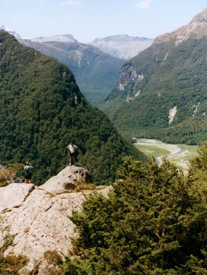 Joy took this photograph of me taking a picture of Evan standing on a rock below the Routeburn Falls Hut. The Routeburn Flats are clearly visible near the middle of the right-hand edge of picture.