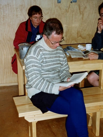 Evan’s photo of me reading a book in the Routeburn Falls Hut (which is, of course, what he was doing when I took his photograph in the hut).