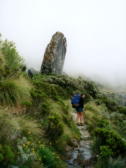 Joy, Keith, Heather, and I left the Routeburn Falls Hut at 8:45 am on Tuesday, 31 December 1996. Evan, however, had left the hut about an hour earlier. Because he’d never been to Milford Sound before, Evan had opted to walk right through from the Routeburn Falls Hut to the Divide in one day and then hitch-hike to Milford Sound. This photograph of Heather on the track between the Routeburn Falls Hut and the Harris Saddle shows how our walk on the last day of the 1996 began under low cloud and mist. |