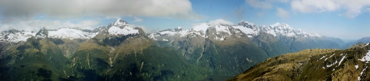 The view from the top of Conical Hill is one of the most stunning 360-degree panoramas I have ever been privileged to see. As a result, I took a series of photographs while I was on the summit and I’ve stitched some of them together to create three panoramic photostitches. The first (created by stitching three photographs together) looks across the Hollyford Valley towards the Darran mountains. Mt Tutoko is the prominent peak about a fifth of the way in from the right-hand edge of the picture, while Martins Bay and the Tasman Sea are just visible in the notch near the right-hand edge of the photograph. |
